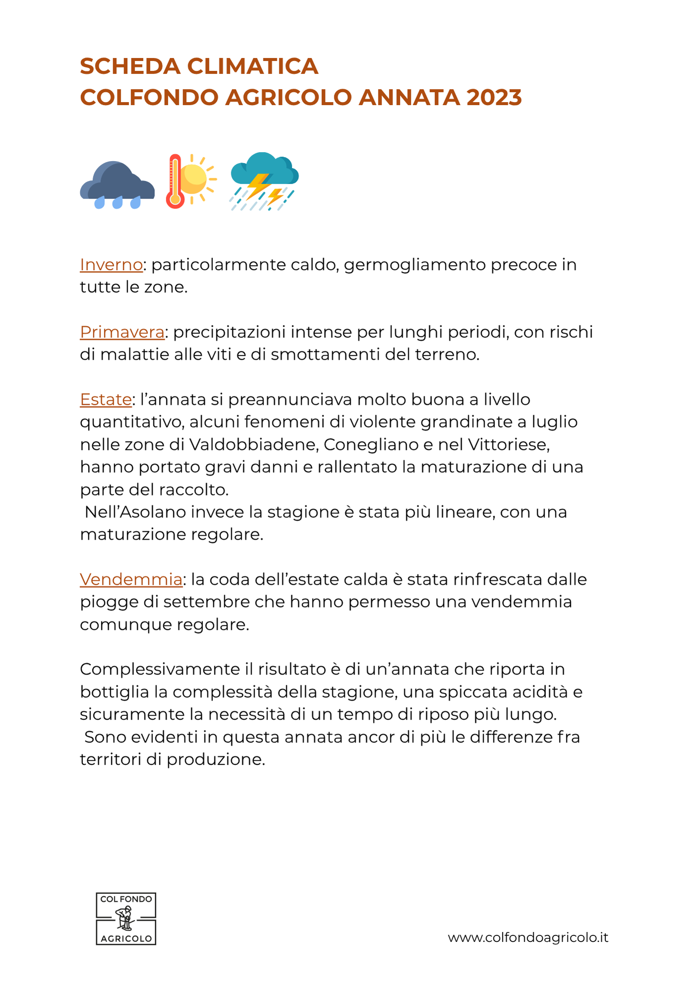 Abbiamo creato delle schede riassuntive per tutto il territorio dei Colli Trevigiani, segnalando comunque alcune criticità che hanno colpito alcune zone particolari. Il territorio di produzione è esteso, le correnti che arrivano dalle Dolomiti o dal Grappa, così come i fiumi, influenzano i fenomeni particolari.